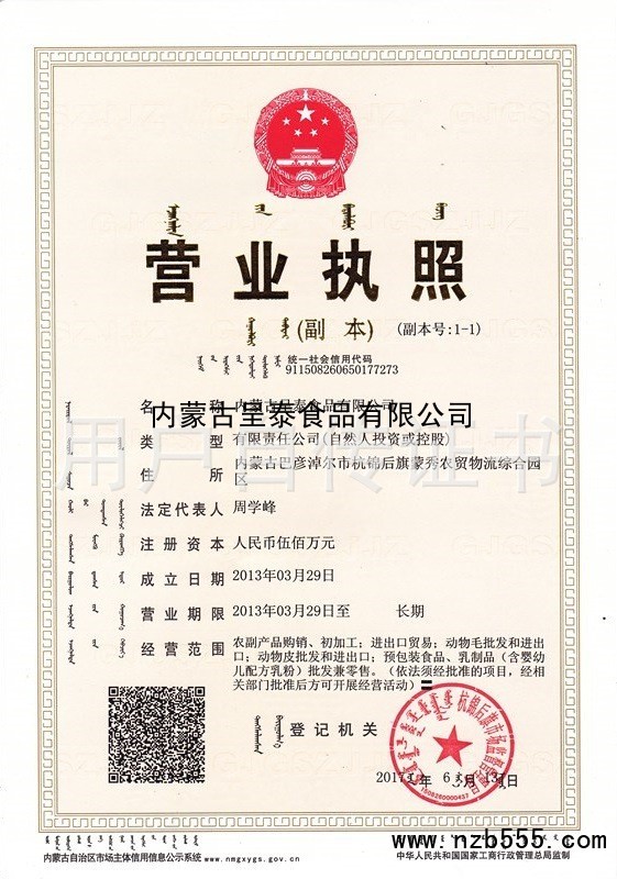 榮譽(yù)資質(zhì) 內(nèi)蒙古呈泰食品有限公司