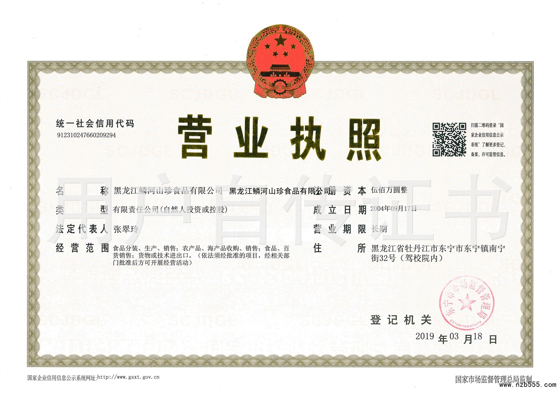| 發(fā)證機(jī)構(gòu): | 東寧縣市場(chǎng)監(jiān)督管理局 | 發(fā)證時(shí)間 : | 2019-03-18 |