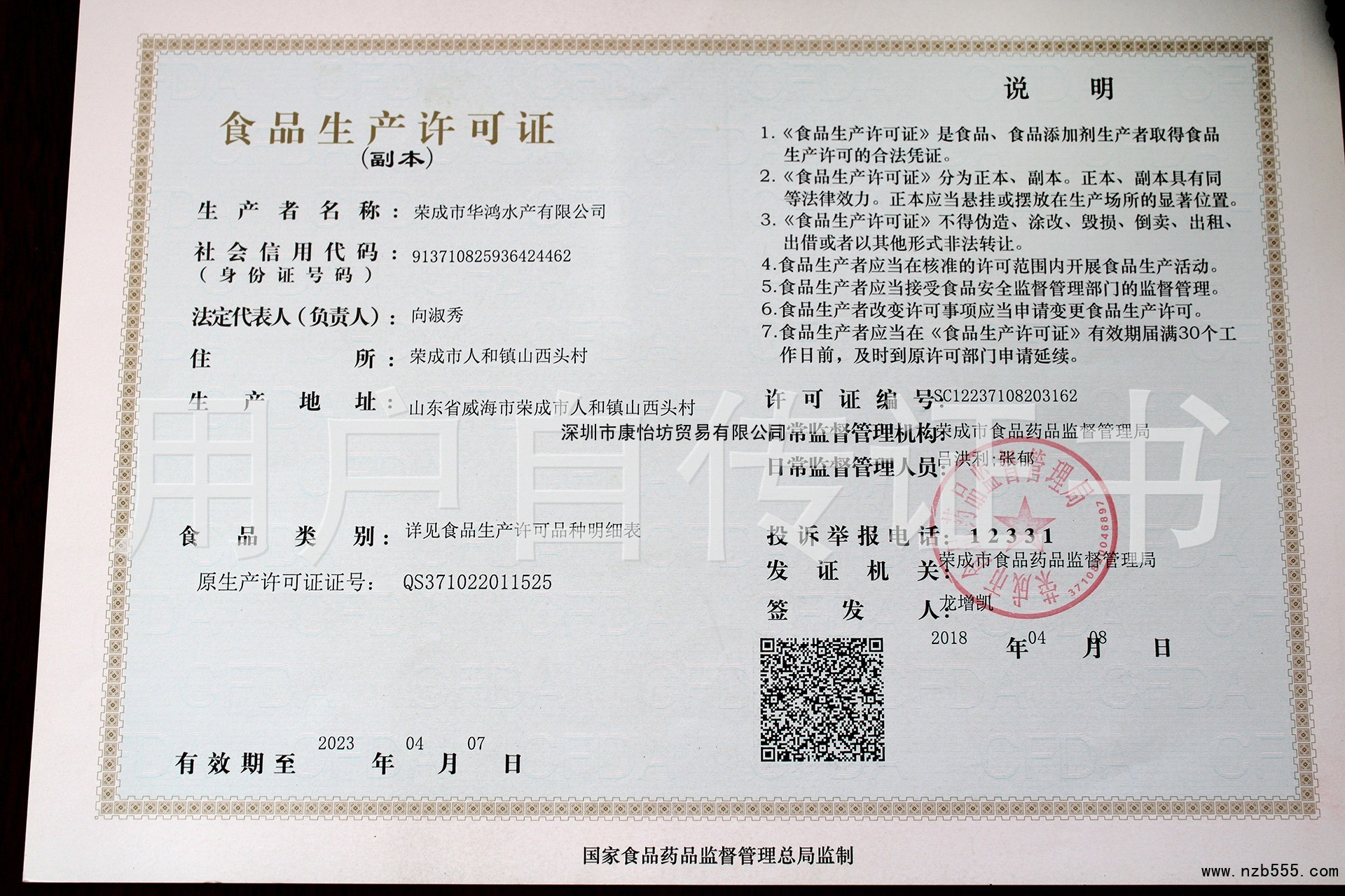 | 發(fā)證機(jī)構(gòu): | 榮成市食品藥品監(jiān)督管理局 | 發(fā)證時(shí)間 : | 2018-04-08 |