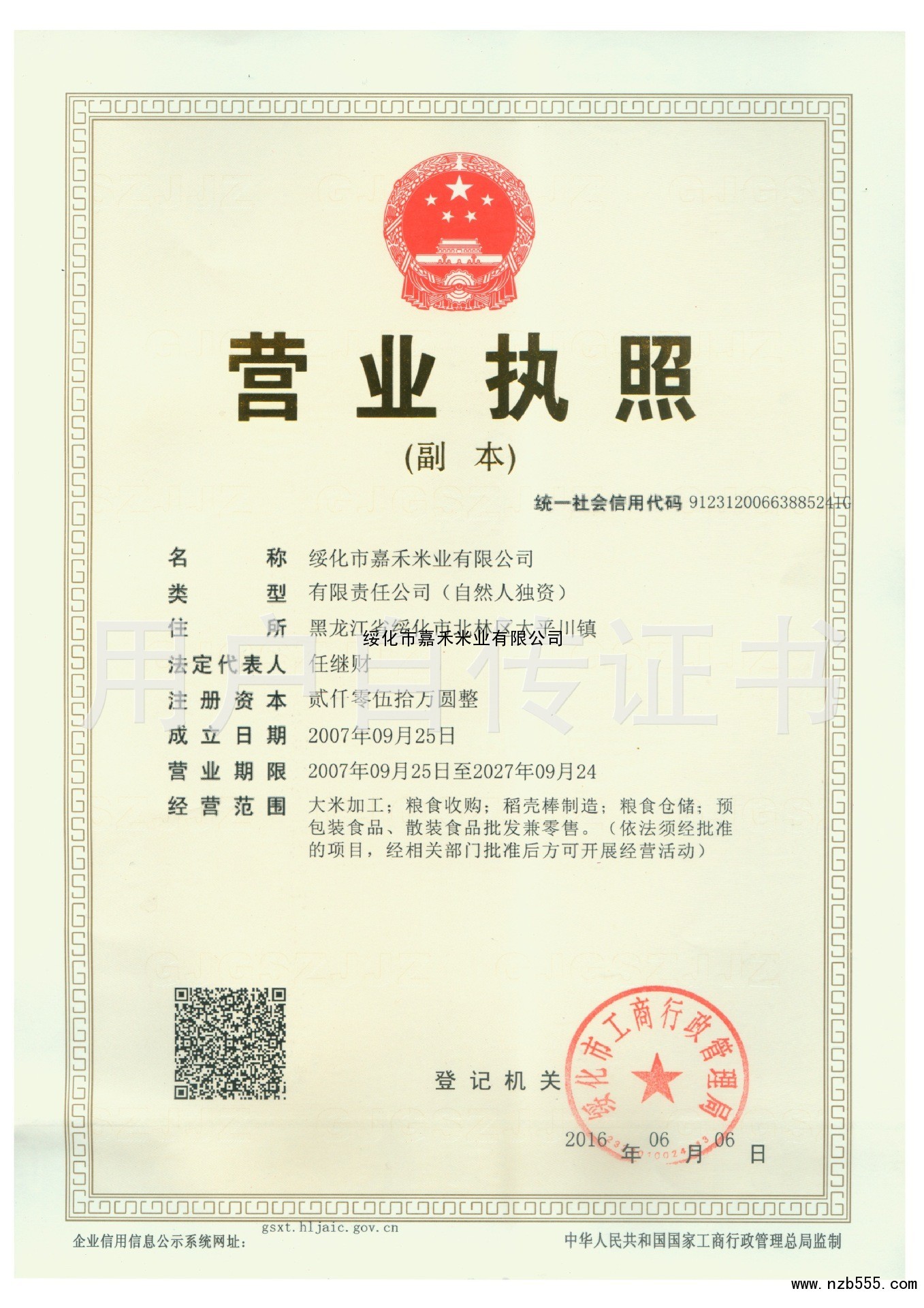 | 發(fā)證機(jī)構(gòu): | 綏化市工商行政管理局 | 發(fā)證時(shí)間 : | 2016-06-06 |