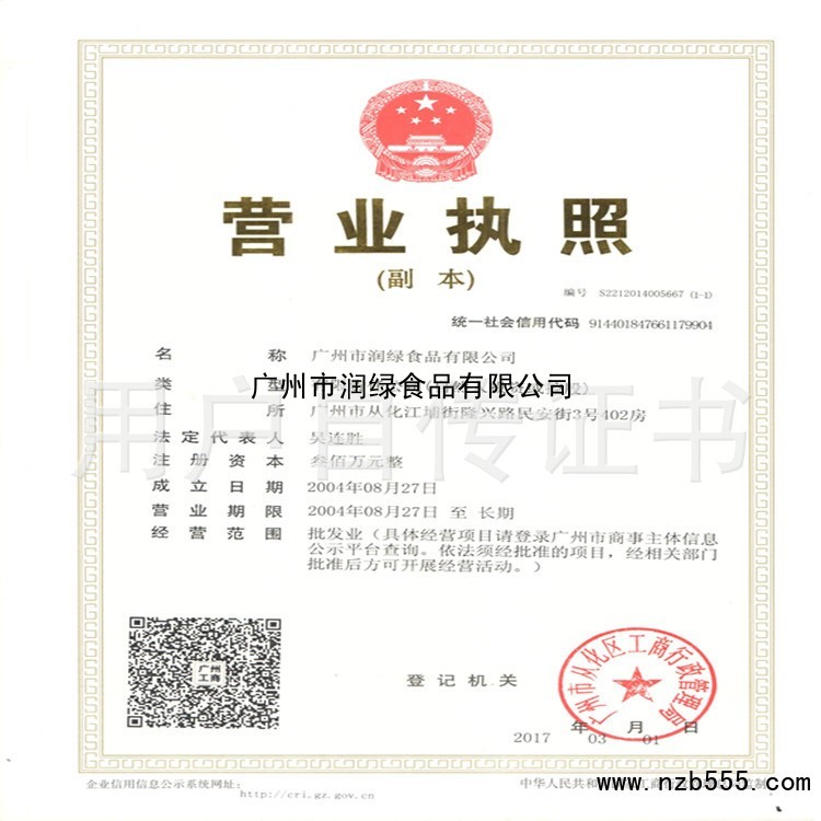 | 發(fā)證機(jī)構(gòu): | 廣州市從化區(qū)工商行政管理局 | 發(fā)證時(shí)間 : | 2017-03-01 |