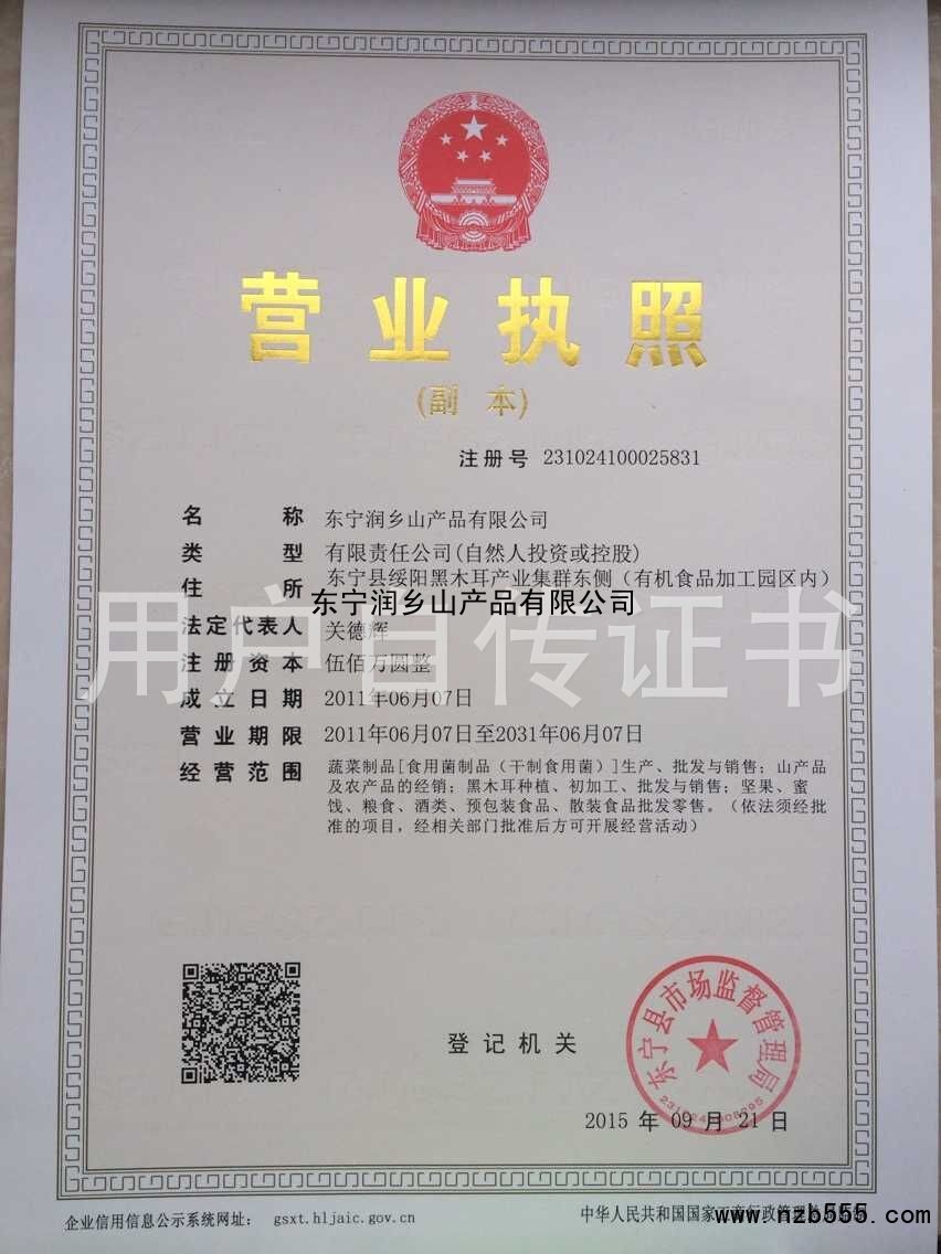 榮譽(yù)資質(zhì) 東寧潤?quán)l(xiāng)山產(chǎn)品有限公司