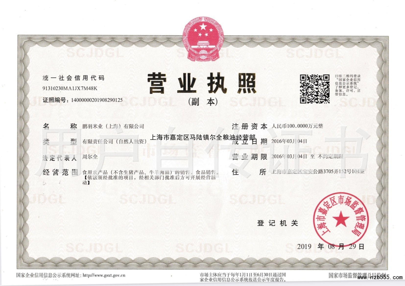 | 發(fā)證機(jī)構(gòu): | 上海市嘉定區(qū)市場(chǎng)監(jiān)督管理局 | 發(fā)證時(shí)間 : | 2019-08-29 |