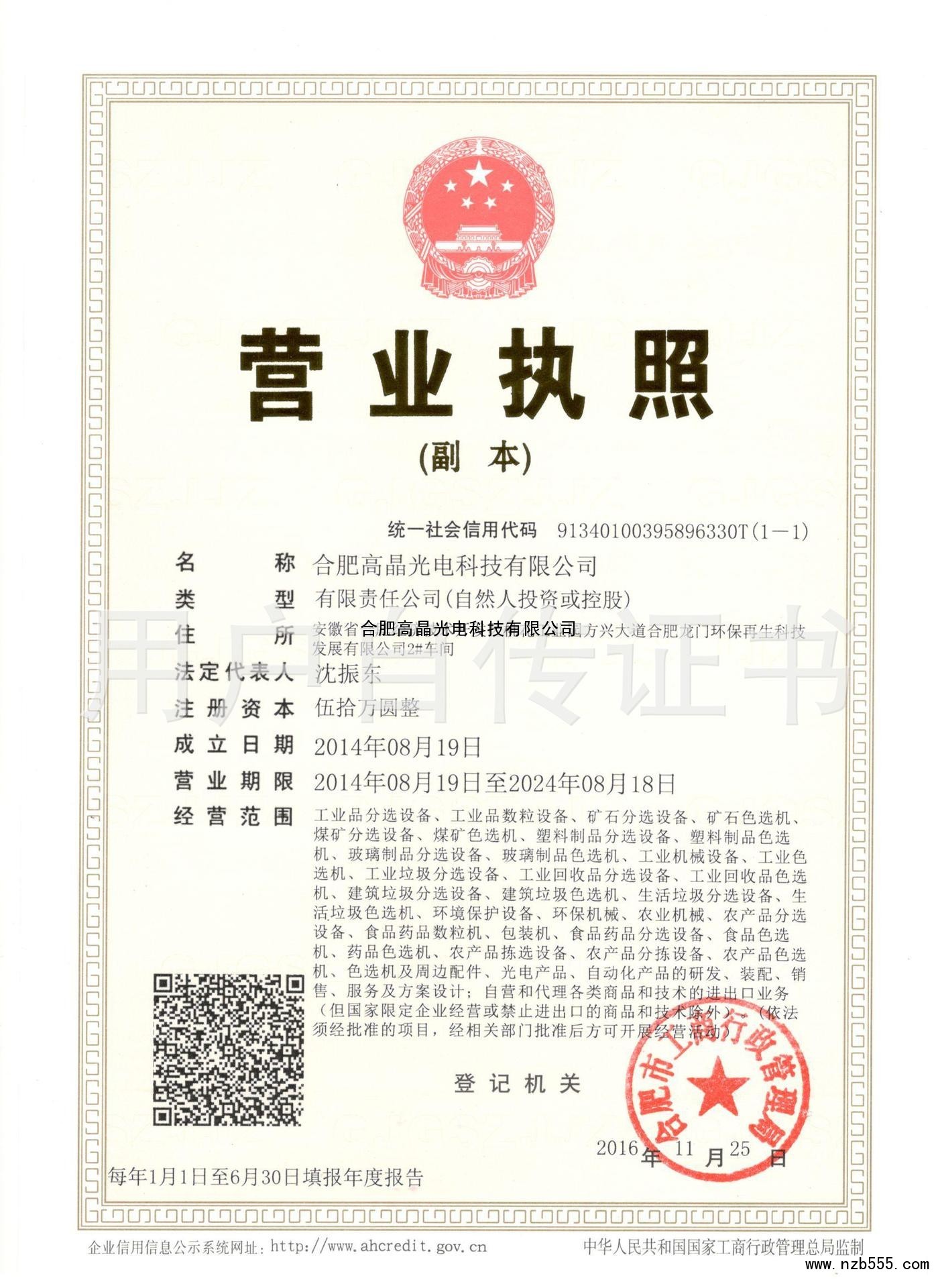 | 發(fā)證機(jī)構(gòu): | 合肥工商行政管理局 | 發(fā)證時(shí)間 : | 2016-11-25 |
