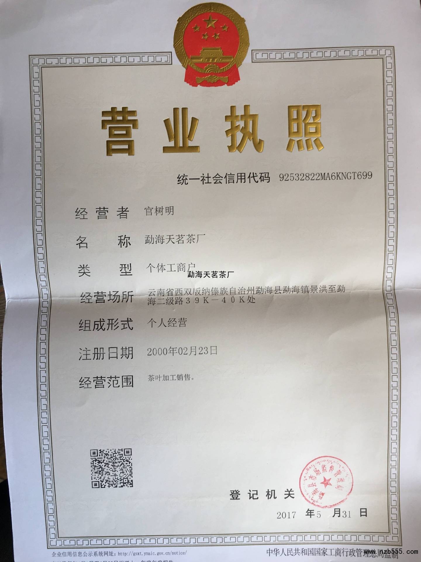 | 發(fā)證機(jī)構(gòu): | 勐海縣市場(chǎng)監(jiān)督管理局 | 發(fā)證時(shí)間 : | 2017-05-31 |
