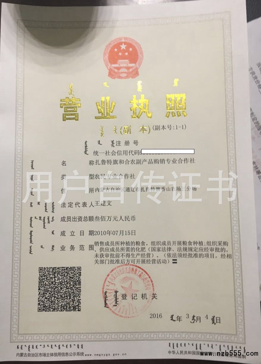 | 發(fā)證機(jī)構(gòu): | 內(nèi)蒙古自治區(qū)扎魯特旗工商行政管理局 | 發(fā)證時(shí)間 : | 2016-03-04 |