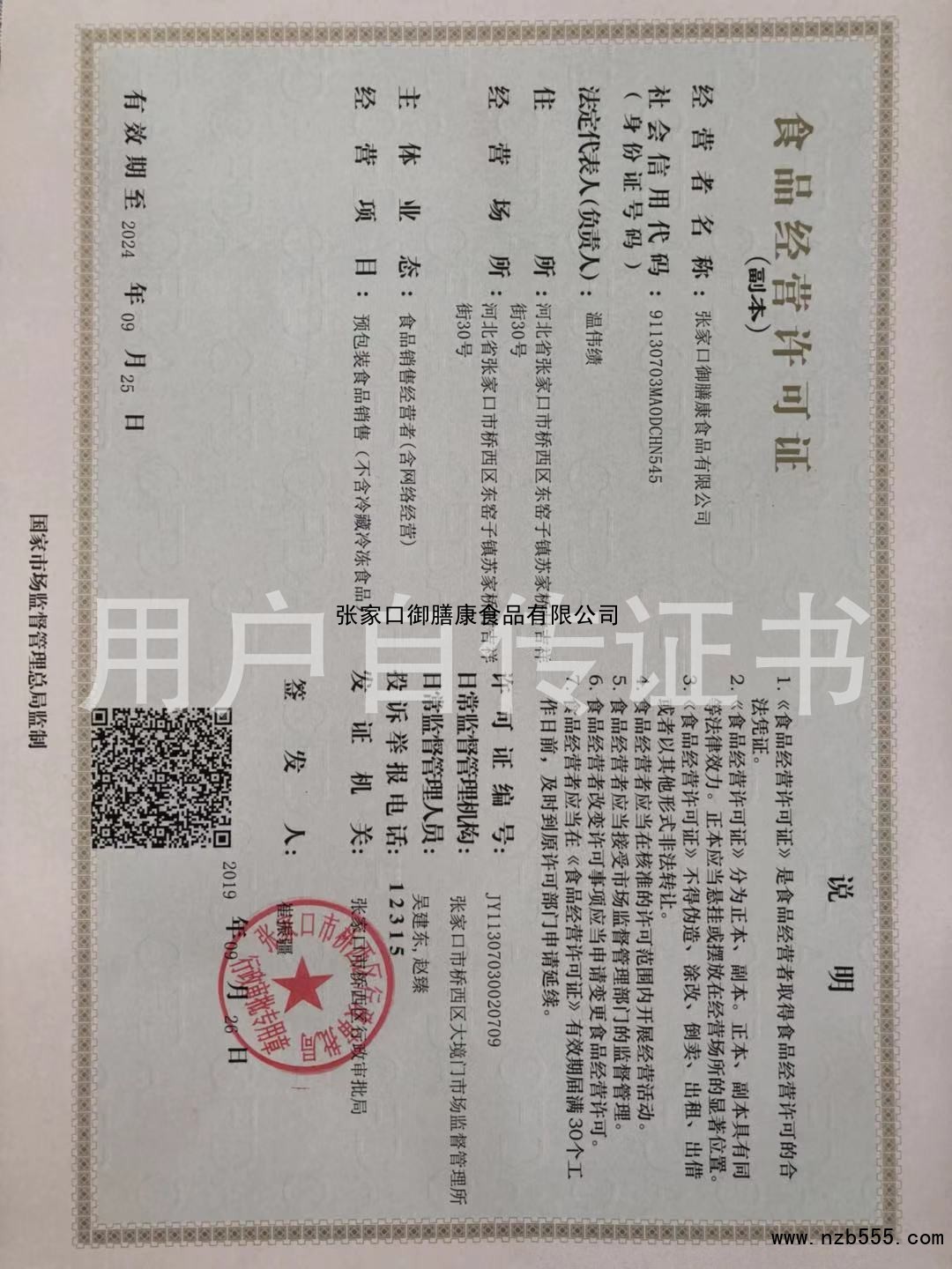 | 發(fā)證機(jī)構(gòu): | 張家口市橋西區(qū)行政審批局 | 發(fā)證時(shí)間 : | 2019-09-26 |