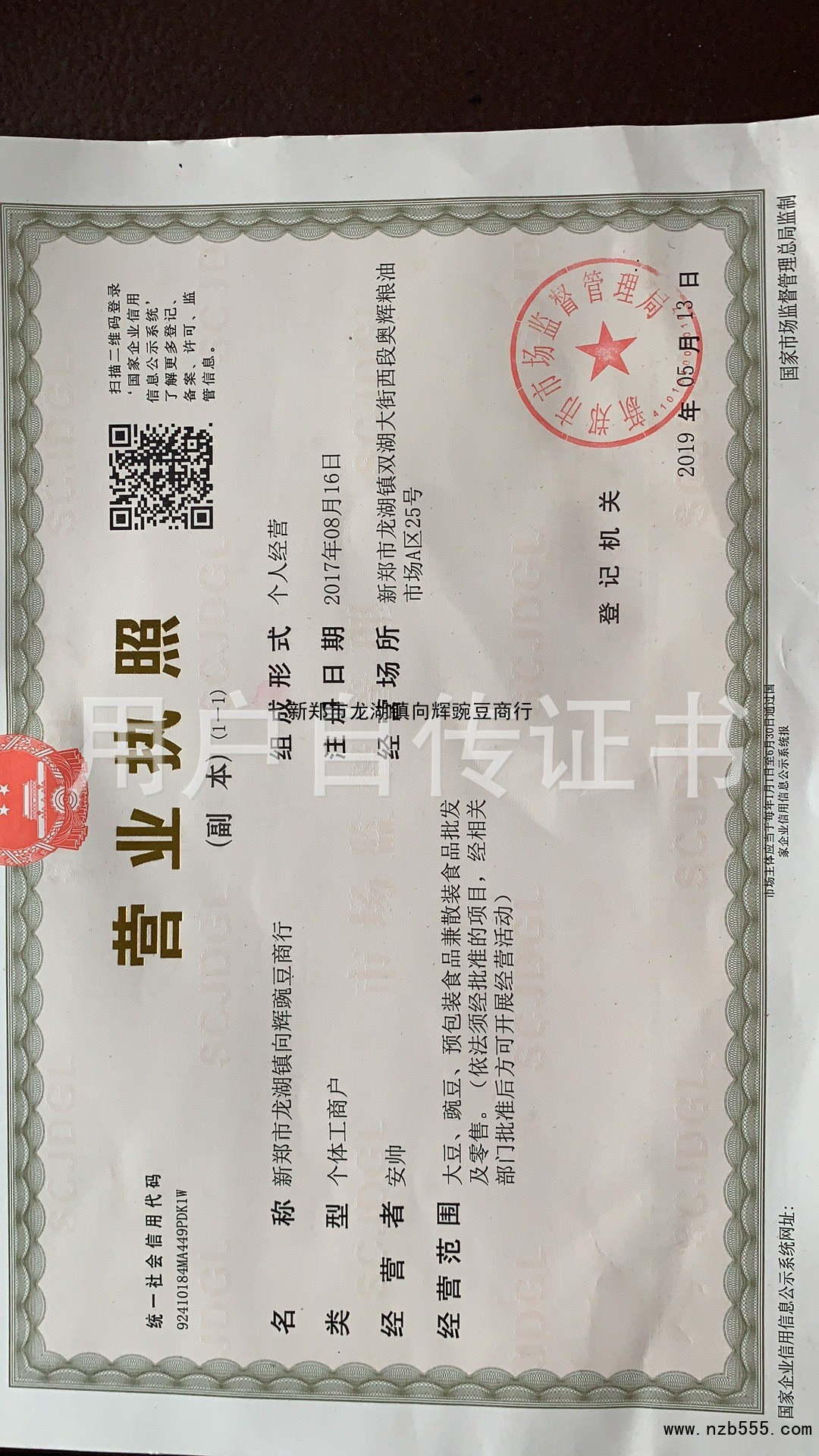 | 發(fā)證機(jī)構(gòu): | 新鄭市市場監(jiān)督管理局 | 發(fā)證時(shí)間 : | 2019-05-13 |