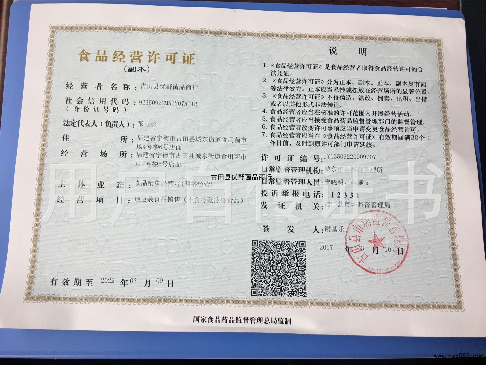 | 發(fā)證機(jī)構(gòu): | 古田縣市場(chǎng)監(jiān)督管理局 | 發(fā)證時(shí)間 : | 2017-03-10 |
