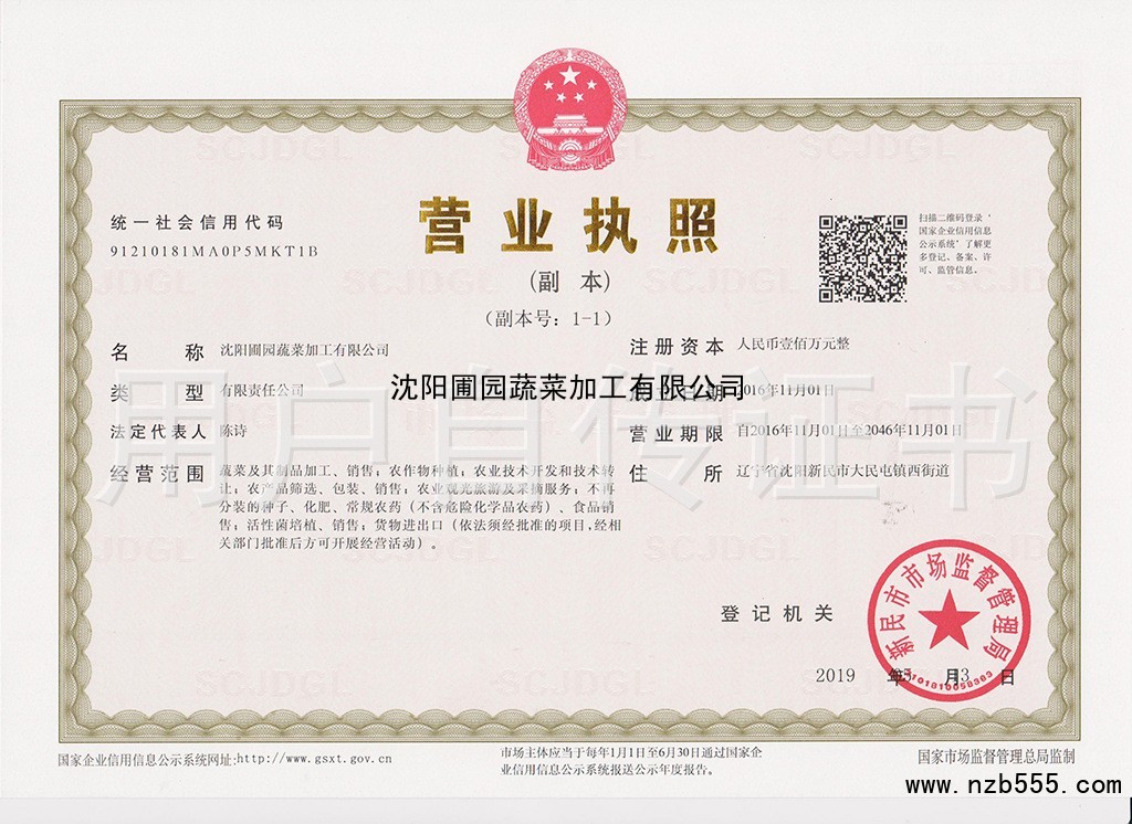 | 發(fā)證機(jī)構(gòu): | 新民市市場監(jiān)督管理局 | 發(fā)證時間 : | 2019-03-03 |