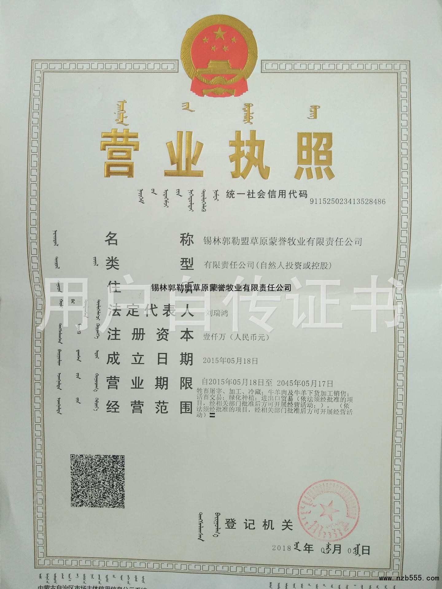 | 發(fā)證機(jī)構(gòu): | 錫林郭勒盟市場(chǎng)監(jiān)督管理局 | 發(fā)證時(shí)間 : | 2018-05-02 |