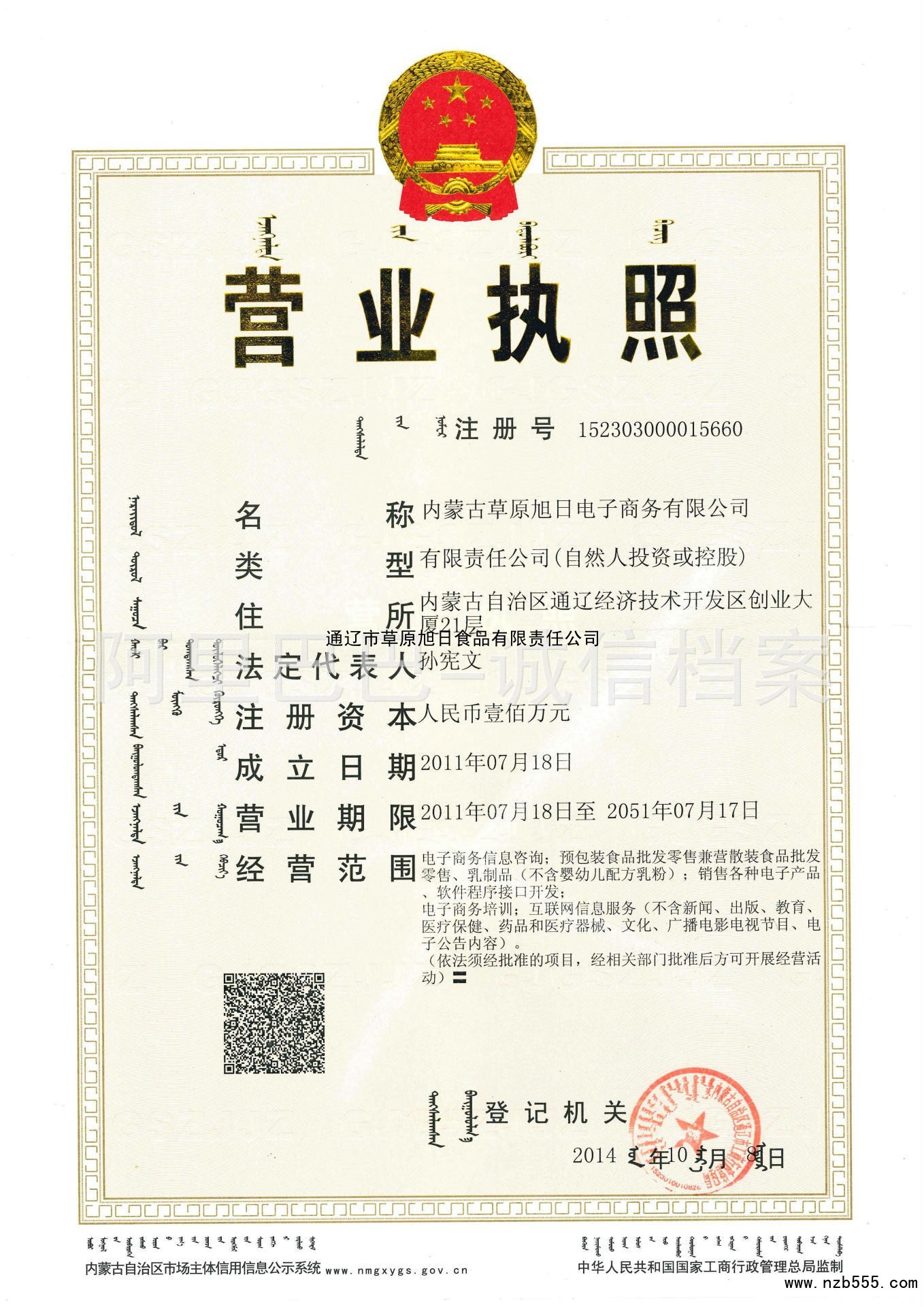 | 發(fā)證機(jī)構(gòu): | 內(nèi)蒙古自治區(qū)通遼市工商行政管理局 | 發(fā)證時(shí)間 : | 2014-10-08 |