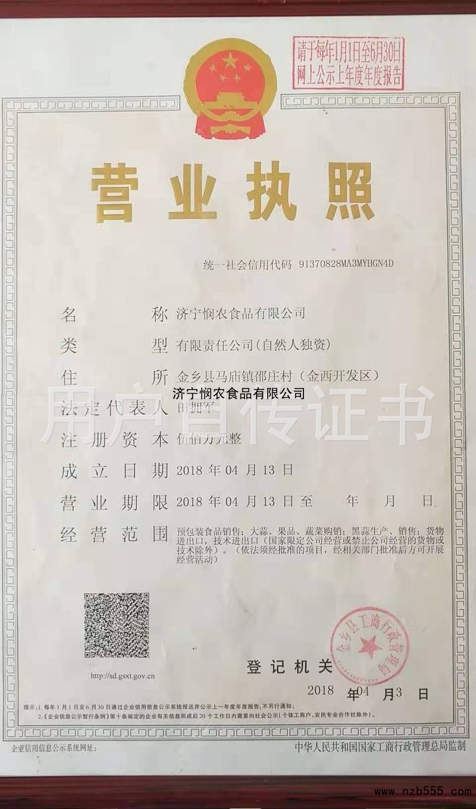 | 發(fā)證機(jī)構(gòu): | 金鄉(xiāng)縣工商行政管理局 | 發(fā)證時間 : | 2018-04-03 |