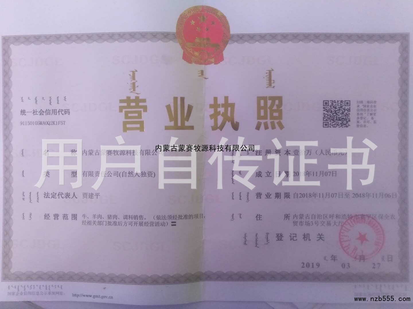 | 發(fā)證機(jī)構(gòu): | 呼和浩特市市場(chǎng)監(jiān)督管理局 | 發(fā)證時(shí)間 : | 2019-03-27 |