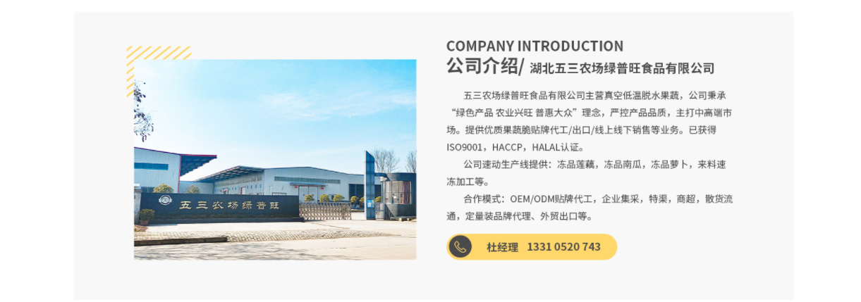 品牌介紹:湖北五三農場綠普旺食品有限公司于2017年11月10日成立,公司經營范圍包括:食品、預包裝食品、健康食品、蔬菜制品、水果制品、茶葉制品、植物提取物、發酵產品的生產、加工、銷售;農產品加工技術研發、技術轉讓,倉儲服務等。是果蔬脆片、果蔬脆片等產品專業生產加工的公司,擁有完整、科學的質量管理體系。湖北五三農場綠普旺食品有限公司的誠信、實力和產品質量獲得業界的認可。 [
