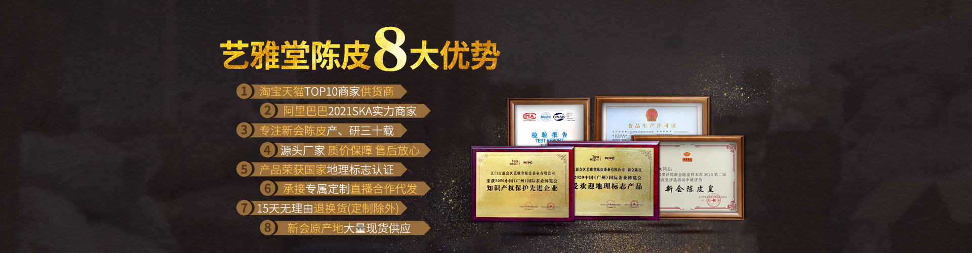 藝雅堂是集新會柑種植基地、原材料批發、食品研發加工、連鎖專賣店、電子商務于一體的新會陳皮實業開發公司。廠區坐落于新會陳皮的核心發源地,工廠面積4000多平方,倉儲3000多平,總占地7000多平,是新會陳皮地理標志保護產品專用標志的使用企業,主營新會陳皮、新會柑胎和陳皮普洱茶。我們秉承以人為本的經營理念,以做高品質產品為使命,以創新為企業宗旨。公司擁有專業的研發技術人員與終端銷售服務團隊,從原材料到研發生產全過程嚴格監控,致力于打造健康的陳皮茶飲品,與廣大消費者分享新會陳皮產品的魅力 [詳細介紹]