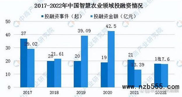 另外,隨著政策對智慧農業領域的大量傾斜,眾多投資人開始“上山下鄉”,試圖從中尋找新的增長機會。自2017年以來,智慧農業投融資事件呈現下降的趨勢,但是投融資金額呈現增長的趨勢。2021年中國智慧農業領域投融資事件21起,投融資金額13.39億元。預計2022年智慧農業投融資事件18起,投融資金額將達17.6億元。