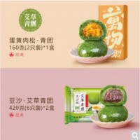 包裝規格【常規版】蛋黃肉松團*3盒,【經典口味】蛋黃肉松*1+細沙*1,蛋黃酥*1+【常規版】蛋黃肉松*1,【經典口味】蛋黃肉松*1+豆沙*2,蛋黃酥*1盒+細沙團*1盒,2口味蛋黃酥+2口味青團,麻芯青團*1+豆沙青團*2,【香甜豆沙】豆沙青團420g*2,肉松團*2盒+細沙團*1盒,【黑芝麻】麻芯青團420g*2