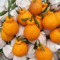 丑柑,學(xué)名“不知火”,又稱“凸頂柑”,“丑桔”,“丑八怪”,“丑橙”等叫法。平均果重200克,較大400克以上。果實倒卵形,多有突起短頸;果皮黃橙色,10月上旬開始著色,12月上旬著色;果皮黃橙色,果面稍粗,易剝皮,果汁糖度在13%以上,較高達(dá)17%,味極甜;次年2~3月成熟,風(fēng)味好。
