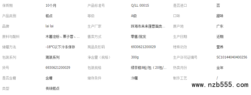 【名 稱】來來綠茶糕點300g 【成 分】木薯淀粉、栗子蓉、飲用水、白砂糖、食用植物油、綠茶粉、奶茶粉 【品 牌】來來 【凈 含 量】300g 【包裝規格】300g/8粒/包 【商品條碼】6930621200029 【原 產 地】珠海 【保 質 期】-18℃以下冷凍貯藏可保質10個月 【貯藏方式】-18℃以下冷凍保存