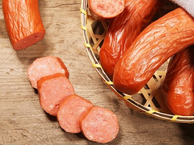 配料表:雞肉,豬肉,水,淀粉,食用鹽,鮮蒜,白砂糖,天然香辛料,大豆蛋白,豬腸衣